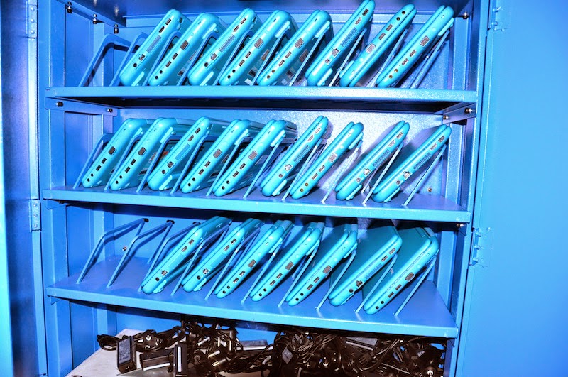Kompyuta mpakato 25 zilizotolewa msaada na Vodacom Foundation kwa ushirikiano na Kampuni ya Samsung katika shule ya sekondari ya Mtakuja iliyopo Kunduchi Beach jijini Dar es Salaam zikiwa zimehifadhiwa katika kifaa maalumu cha kuhifadhia na kuchajia Kompyuta hizo.